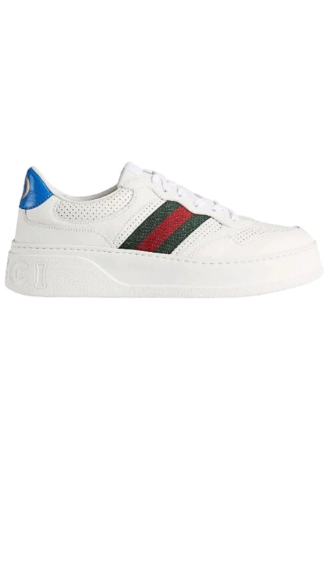 A faixa Web da Gucci remete diretamente às origens da marca no mundo dos esportes equestres e, a cada estação, ela evolui e assume novos shapes e interpretações. O detalhe aparece em vermelho e azul neste tênis de couro e dá destque ao tema do esporte e do lazer. Além disso, a modelagem chunky dá um ar retrô a esta peça.